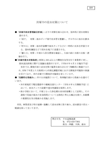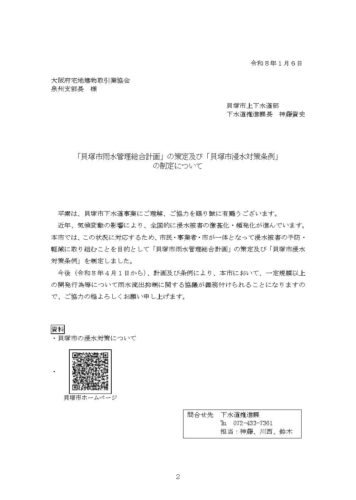 【貝塚市より】貝塚市雨水管理総合計画の策定および貝塚市浸水対策条例の制定について 2026/01/06 7.まちづくりのための自治体対応プロジェクトチーム 令和8年4月1日から、計画及び条例により貝塚市において一定規模以上の開発行為等について、雨水流出抑制に関する協議が義務付けられることになります。 詳しくは、下記資料または資料内QRコードより貝塚市HPをご覧ください。クリックするとPDFが開きます。 問い合わせ先 貝塚市 下水道推進課 TEL:072-433-7361 まちづくりのための自治体プロジェクトチーム (2026.1.6)