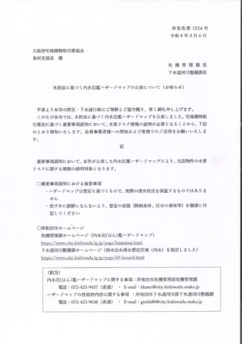 岸和田市より、水防法に基づく内水氾濫ハザードマップが公表されました。