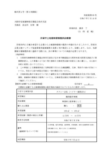 【貝塚市より】 土地建物情報提供依頼のお知らせ 2025/07/10 e.事務局 貝塚市より、貝塚市内に立地を希望する企業から土地建物情報の提供の申請があり、情報提供依頼がありましたのでお知らせします。 情報を提供いただける会員様は、 7/22(火)までに泉州支部事務局(TEL:072-438-9001)へご連絡ください。 提供を依頼する土地建物情報は、下記画像をクリック↓ ※今回の依頼は、貝塚市との企業立地促進のための土地等情報の収集及び提供に関する協定書に 基づくものです。 2025.7.10 事務局